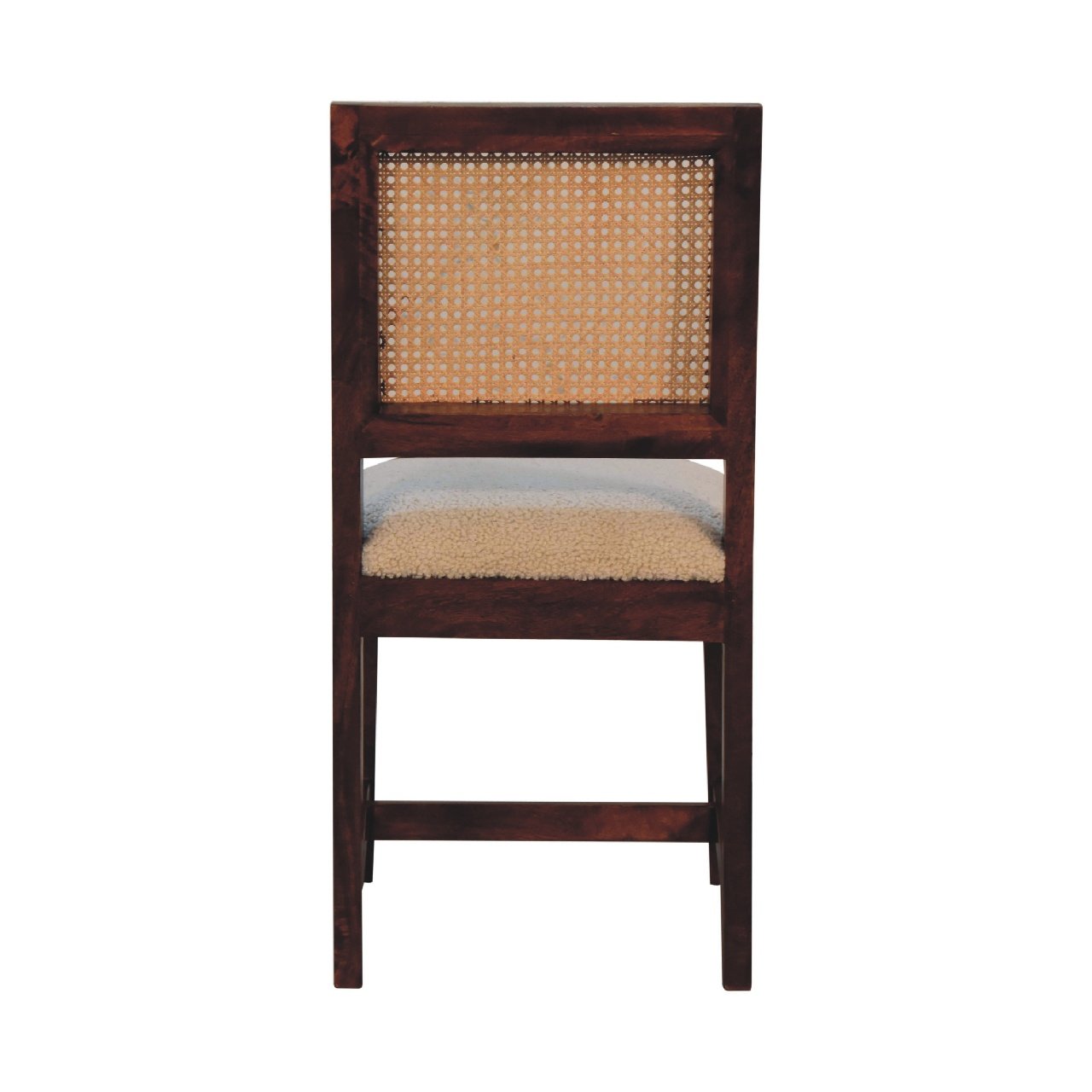 Derived from the French word for ‘curled’ or ‘ringed’ yarn or fabric. This handwoven upholstered furniture piece is made of 100% cotton and natural yarn, combing a solid wood frame and legs which are constructed from 100% solid mango wood in an chestnut finish, and a uniquely designed rattan back, allowing both finishes and materials to compliment each other beautifully.