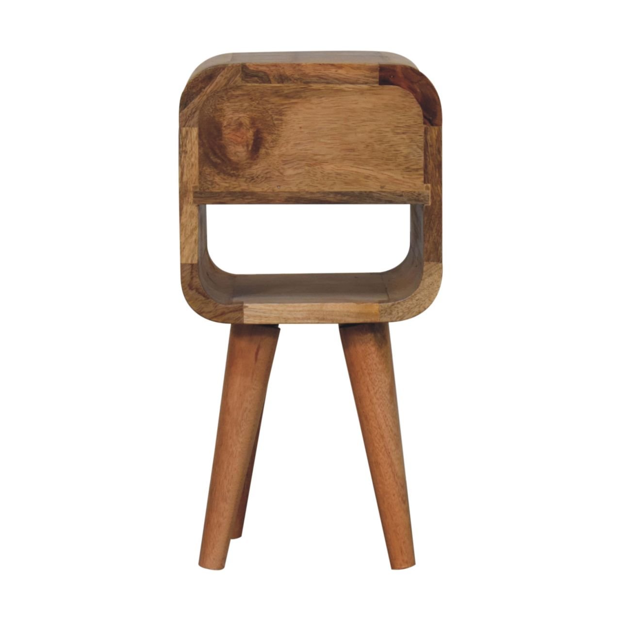 This ultra-compact bedside table is a versatile addition to any space, perfect as a spot for snacks, drinks, or a small lamp. Crafted from 100% solid mango wood with a oak-ish finish, it features softly curved edges, one convenient drawer, an open storage slot, and four Nordic-style legs. Part of our Recession Collection, this stylish piece offers functionality and charm for smaller spaces.