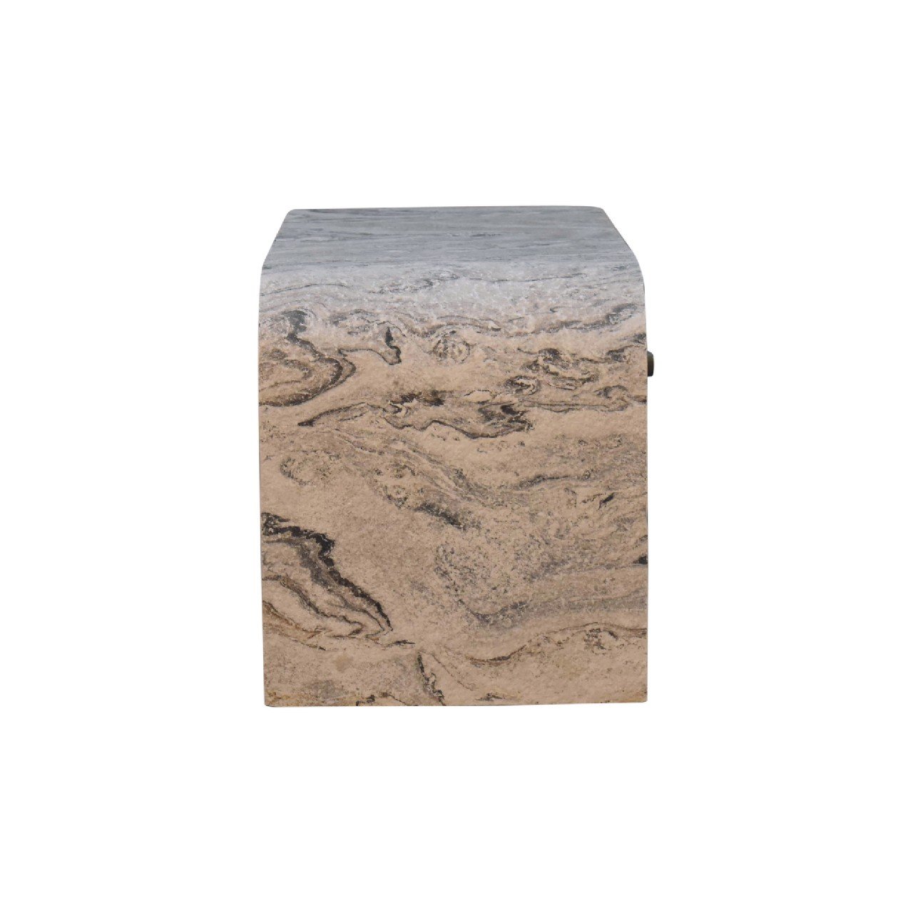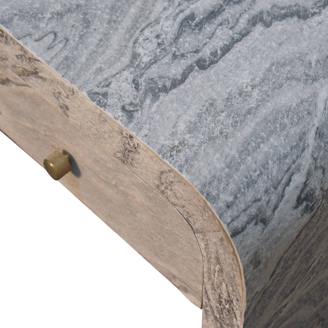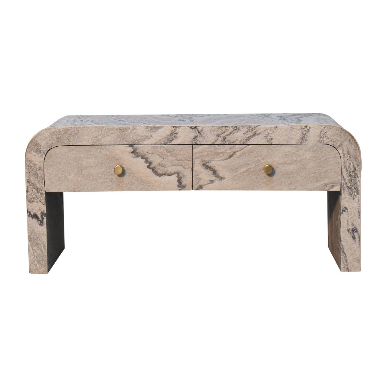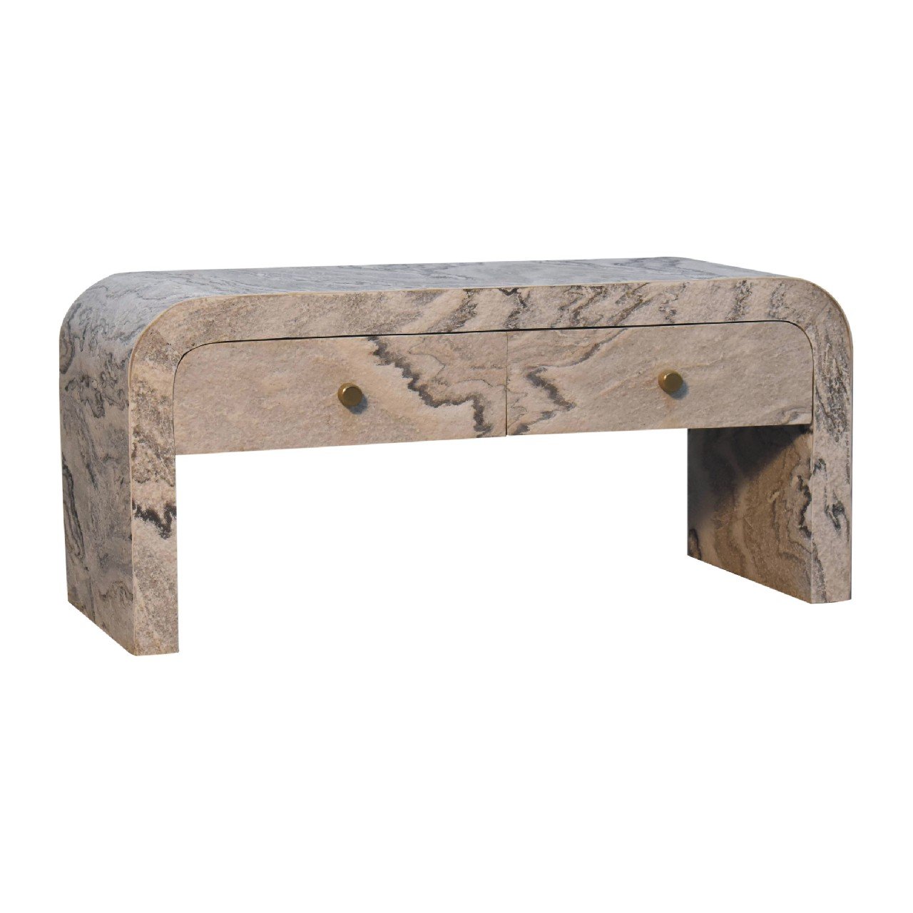 Introducing the “Nouveau” Media Unit, a symbol of refined luxury. Crafted from Solid Mango wood with an oak-ish finish inside the drawers, the body features a laminated marble effect stone veneer. Adorned with a shiny brass round knob, and 2 drawers, this media unit exudes opulence and sophistication, making it a timeless addition to any upscale living room.
